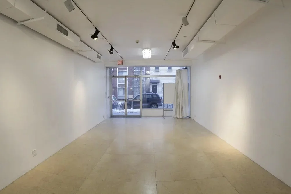The Small Studio (15 ft x 45 ft) functions as a rehearsal studio, gallery, box office, and meeting space, and features floor-to-ceiling storefront windows looking out onto Manhattan Avenue, track lights, and a sprung wooden dance floor.