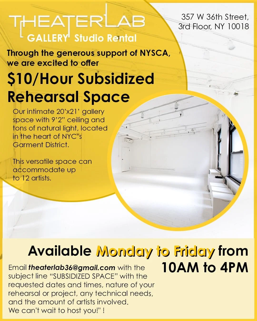Through the generous support of NYSCA, Theaterlab is able to offer $20-30/Hour subsidized rehearsal space in their gallery space. It is available Monday to Friday from 10am-4pm.