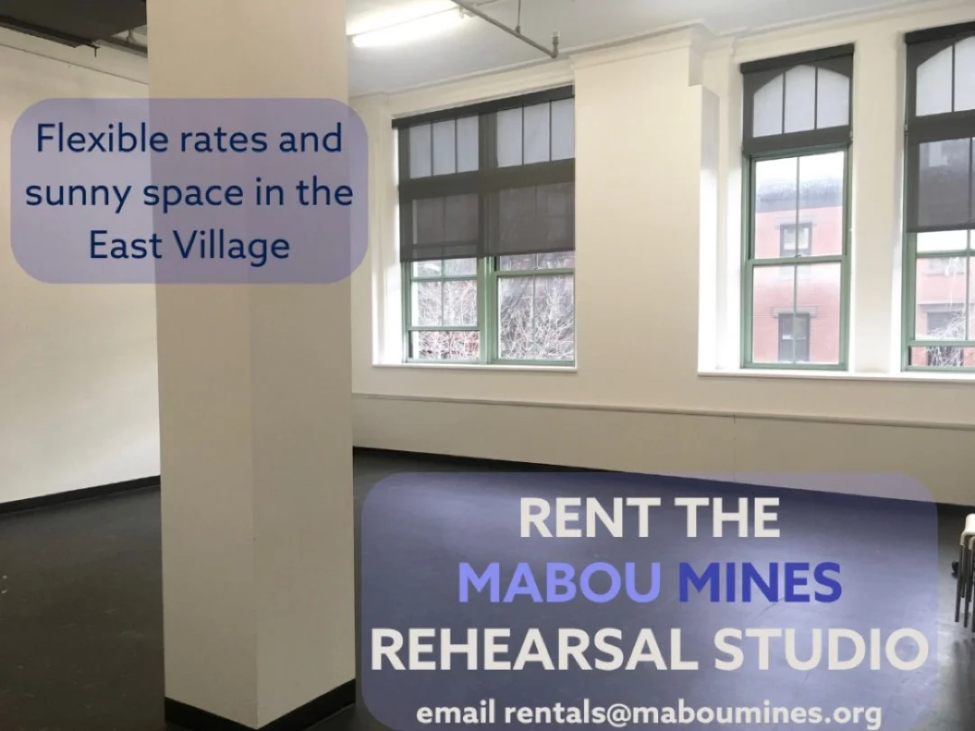 The Mabou Mines studio is available for rent through their non-profit subsidized rental program.