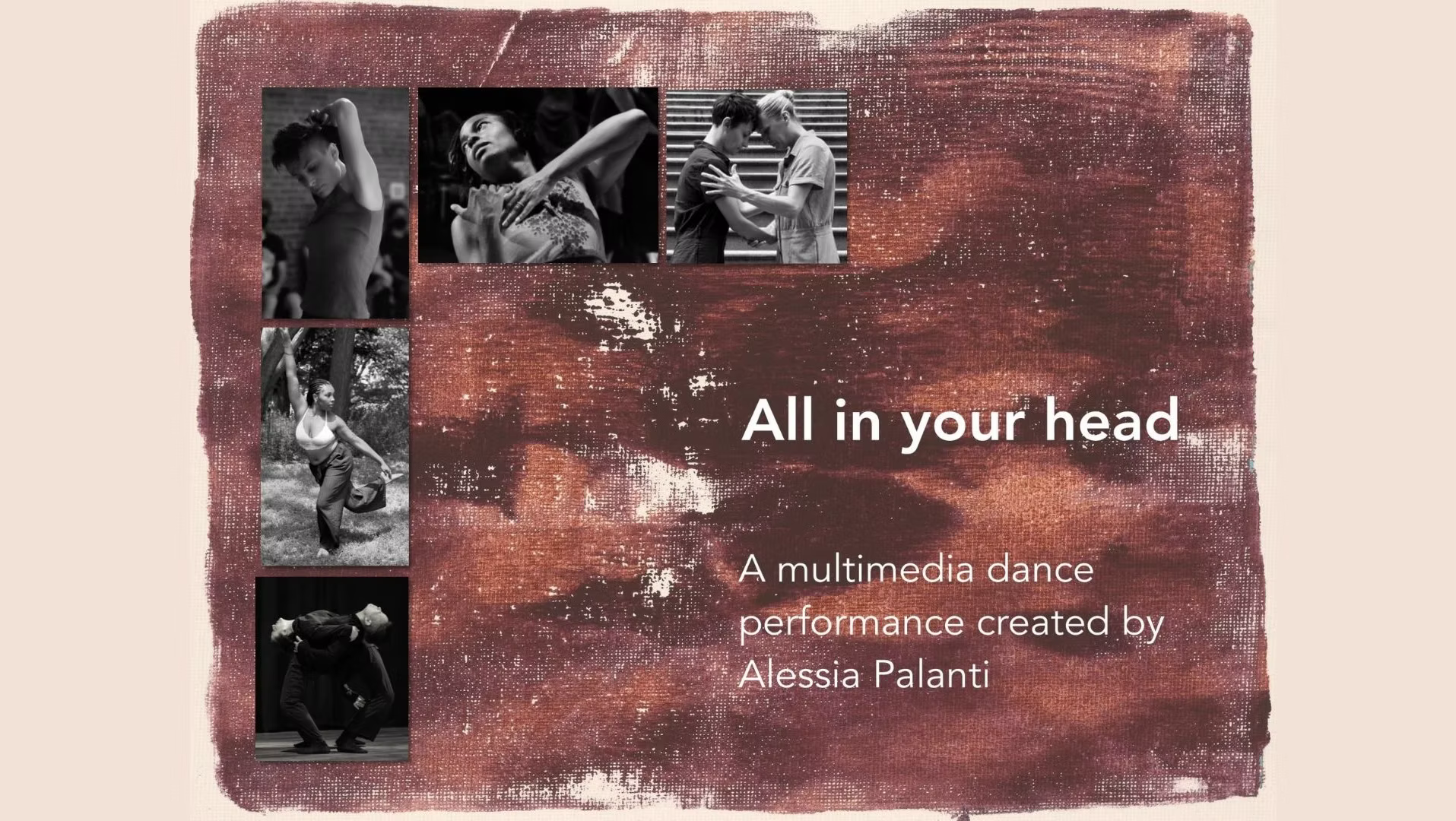 This multimedia dance performance offers a series of solos and duets threaded together by visual art to form one continuous experience. All in your head draws on the ambiguity of perception in a time when we can barely agree on a shared reality. It attempts to create a shared reality—if only for an hour—where our experiences may differ, but we can agree: something happened here, and it was real. Or at least, it felt that way.