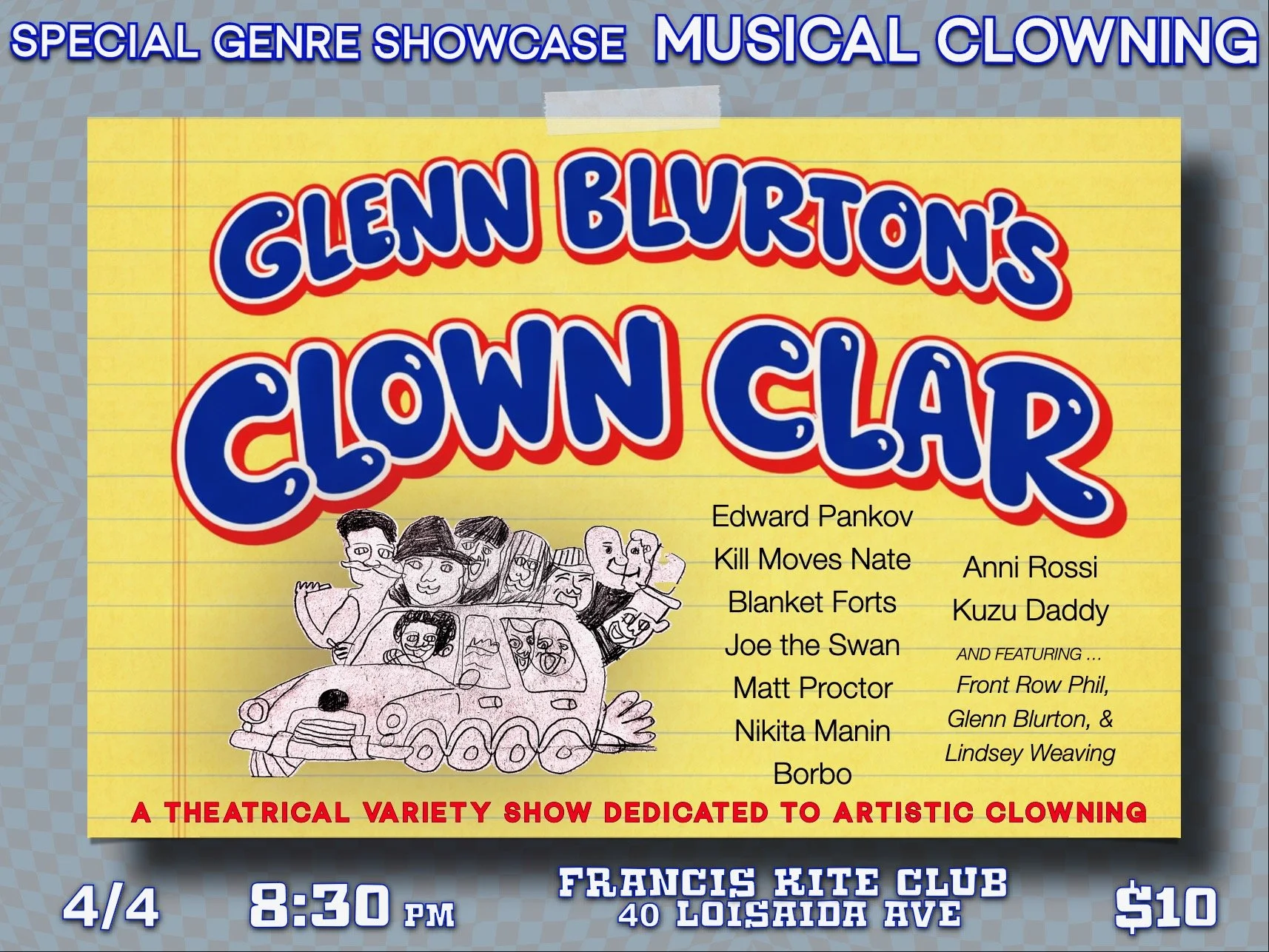 A theatrical variety show dedicated to artistic clowning, presented as a cohesive staged world rather than a loose lineup. This edition is a special showcase of musical clowning, featuring newly devised acts by Anni Rossi, Borbo, Edward Pankov, Kuzu Daddy, Matt Proctor, Joe the Swan, Kill Moves Nate. This show will be hosted by a trio of clowns, in character the entire time: Glenn Blurton, Front Row Phil, and Lindsey Weaving. The show blends playful onstage interaction with original work developed specifically to present the intersection of clowning and musical performance.